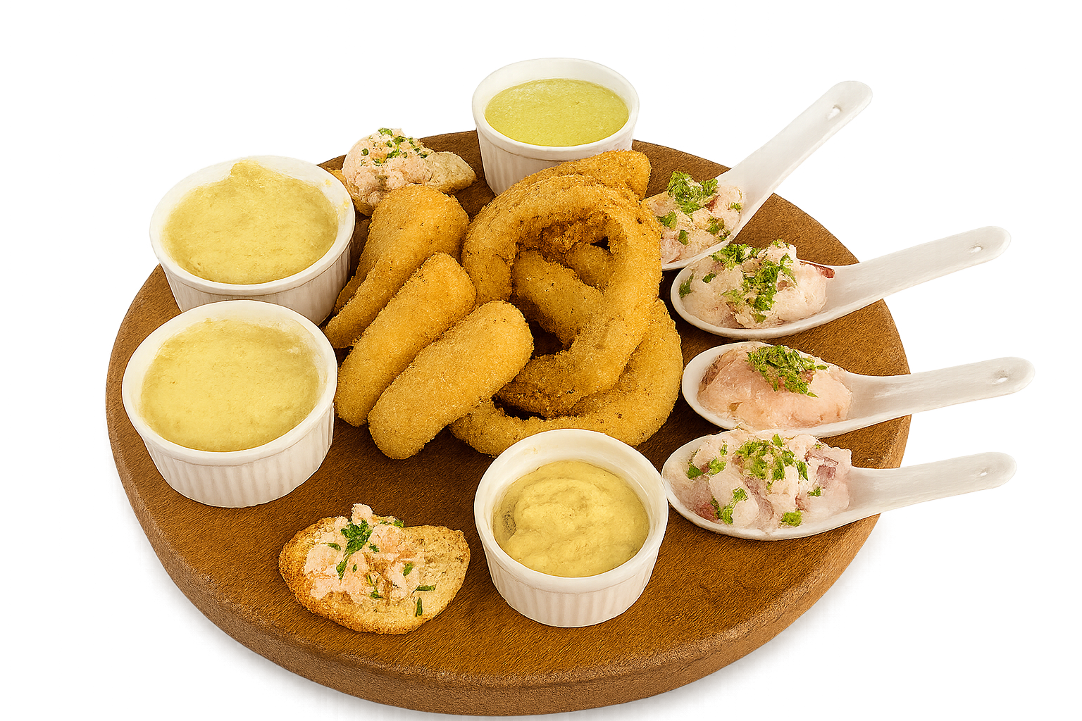 Ceviche de salmón, ceviche de pulpo y congrio, anillos de calamar apanados, chupe de mariscos, bastones apanados de pescado, bocados de salmón ahumado con queso filadelfia, con salsas de pepino palta y tártara.